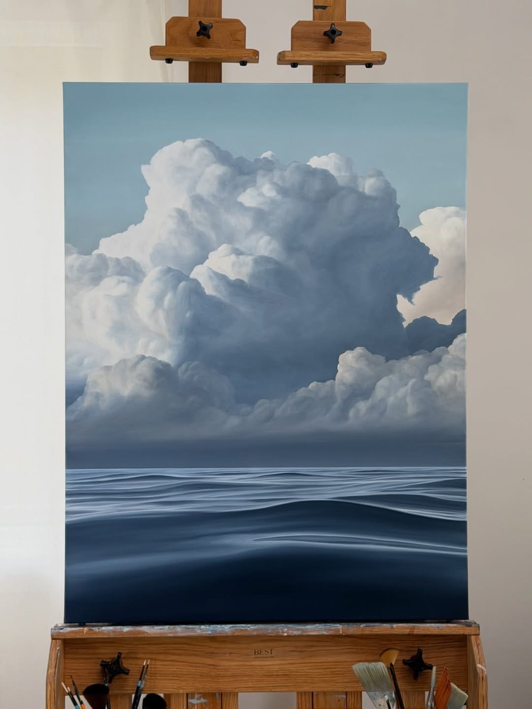 We’re so excited to share our newest print release: Cloudy Afternoon by Derek Macara — a peaceful, horizon-spanning oil painting where the sea melts into the clouds.